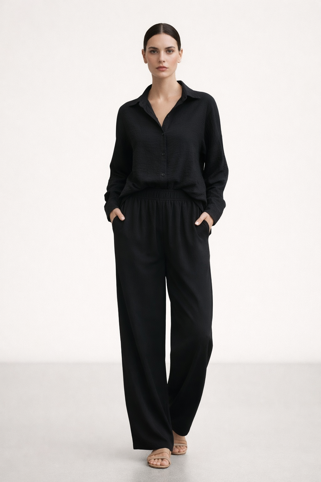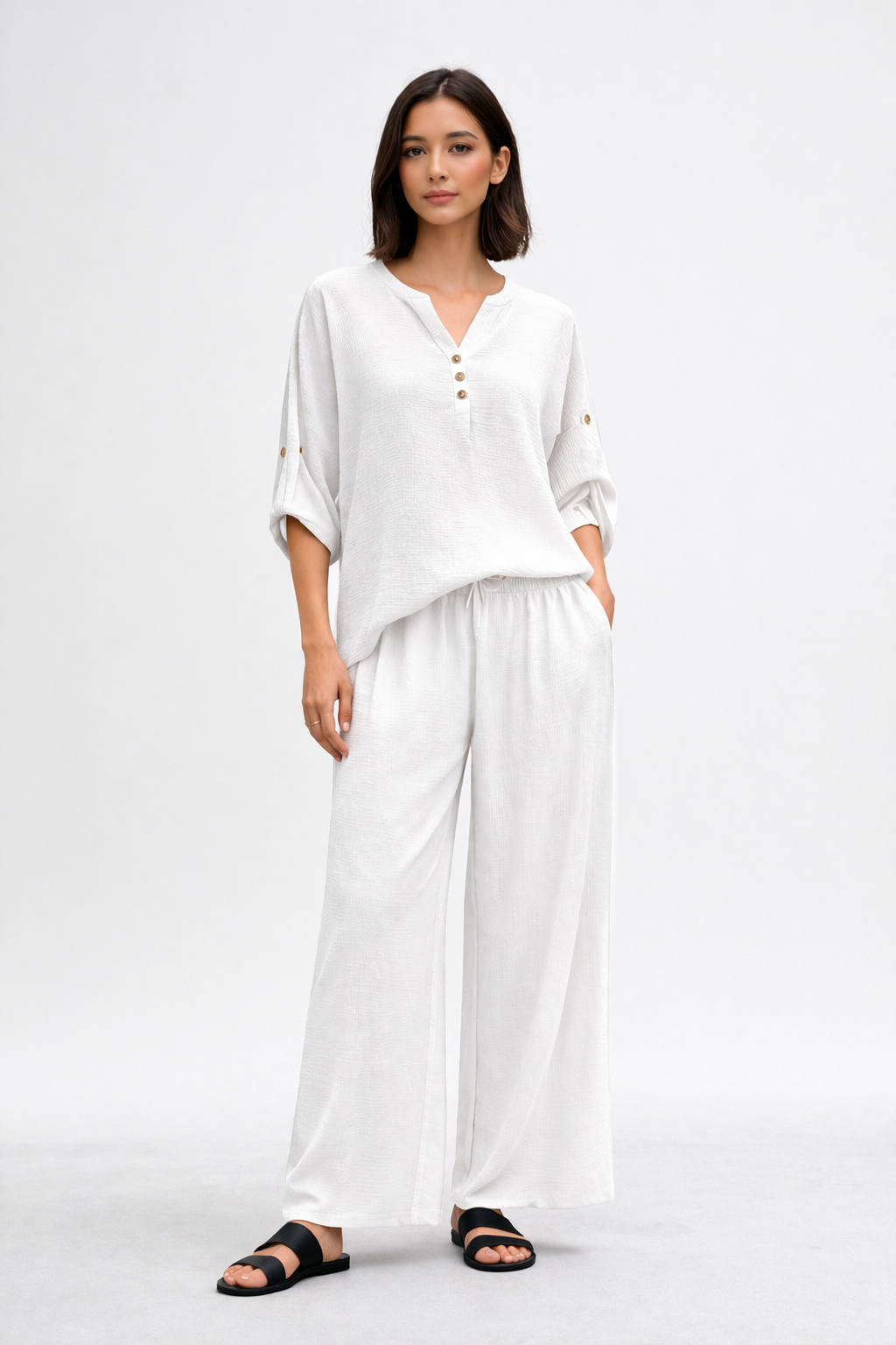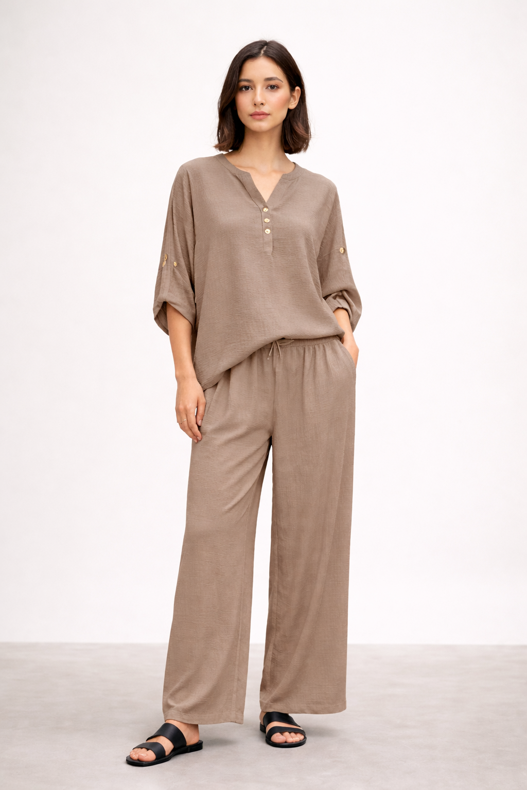 Adoptez un style à la fois naturel et raffiné avec cet ensemble fluide aux lignes épurées. Composé d’un haut léger à manches retroussables et d’un pantalon large à taille élastique, il offre un confort absolu tout en sublimant la silhouette avec simplicité.