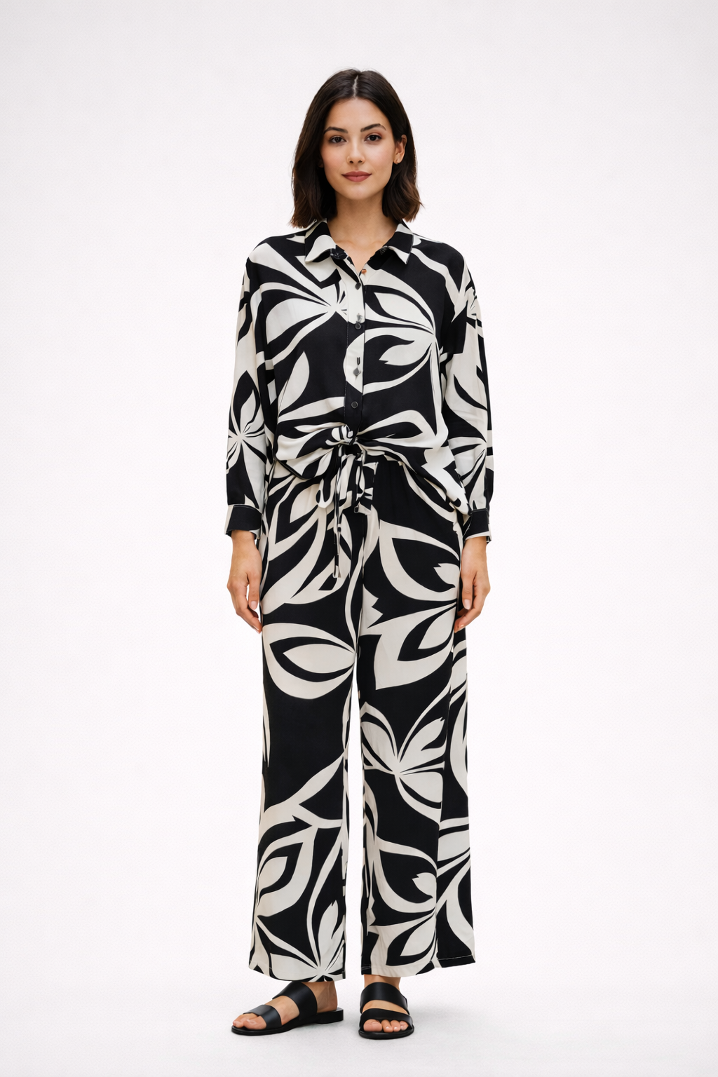 Craquez pour cet ensemble incontournable qui allie parfaitement élégance, confort et modernité. Avec son imprimé noir et blanc ultra tendance, il attire immédiatement le regard et apporte une touche de caractère à votre style.