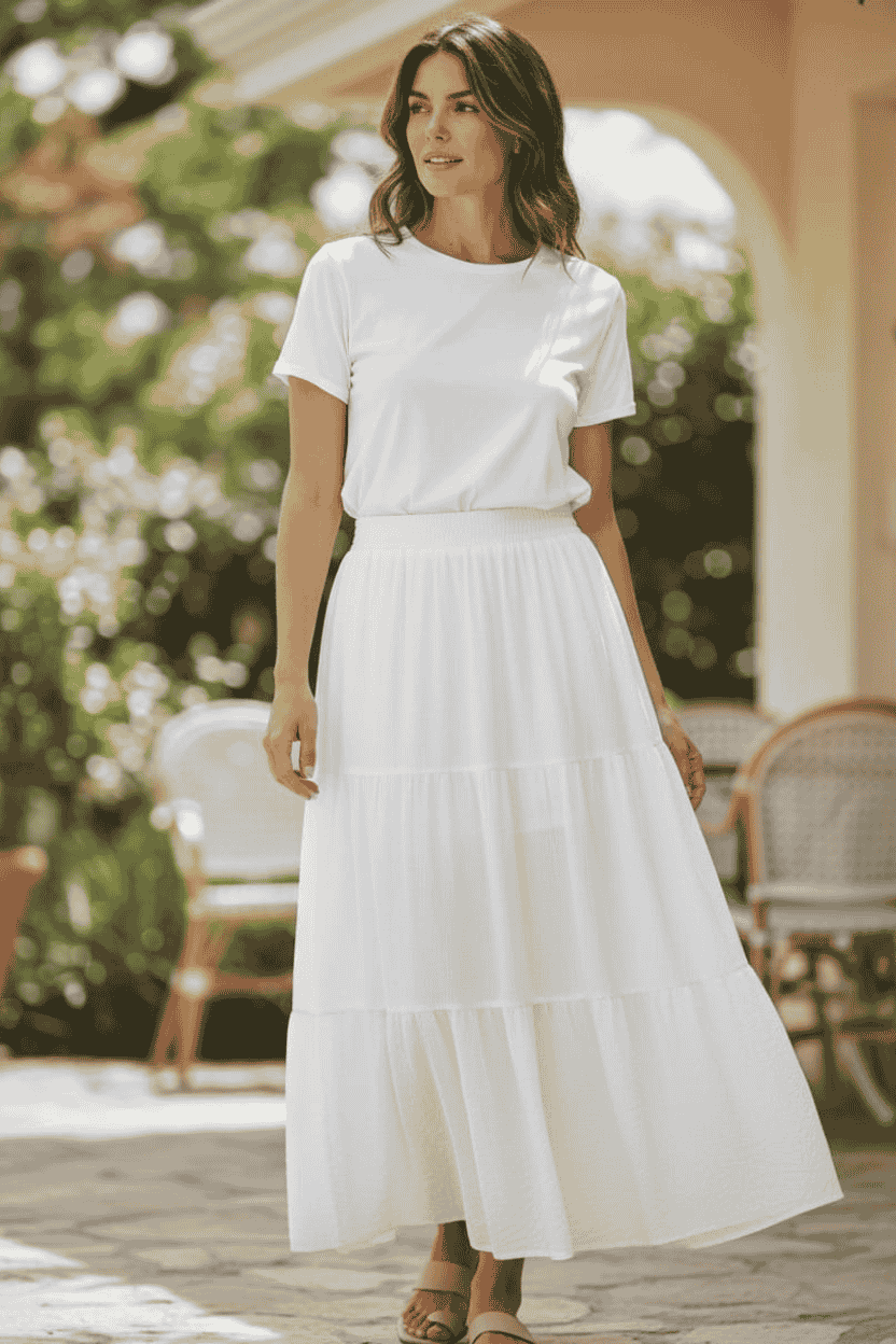 Facile à associer, la jupe Alba se porte aussi bien avec un t-shirt simple, une blouse élégante, un top en dentelle ou un pull léger pour créer des looks variés, du casual chic au style bohème.
